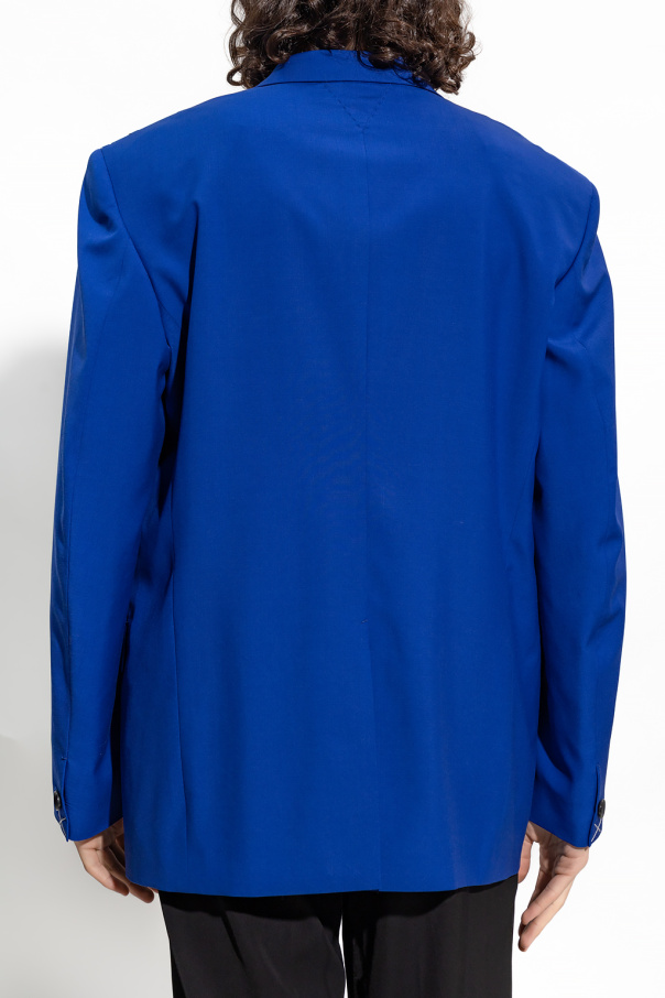 Navy blue single-breasted blazer from Versace. Crafted from a virgin wool and silk blend, this style fastens with buttons and features notch lapels, two flapped pockets, long sleeves with button cuffs and a single back vent.