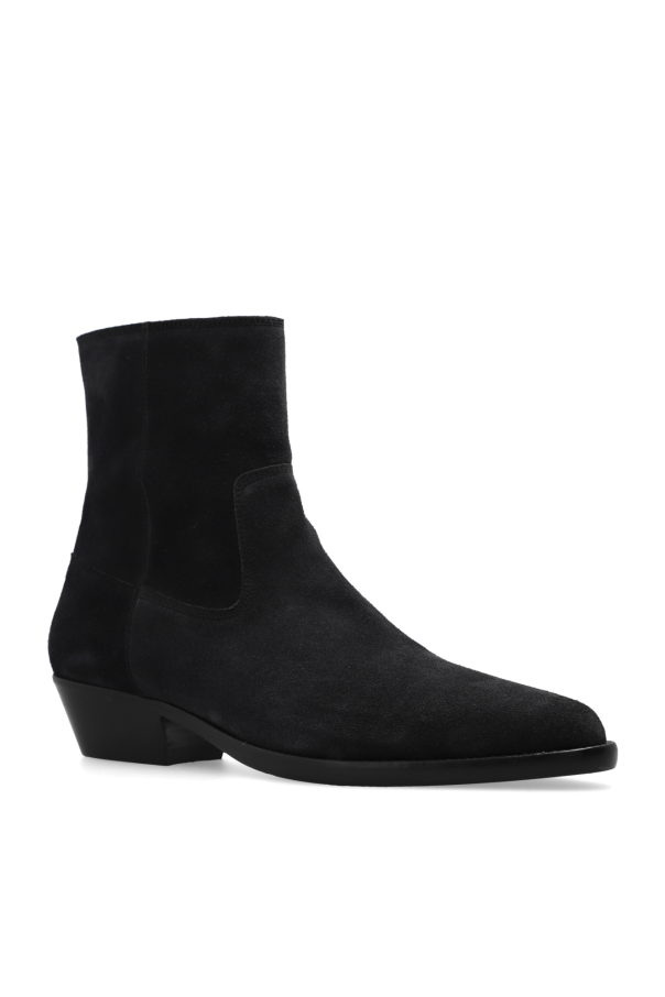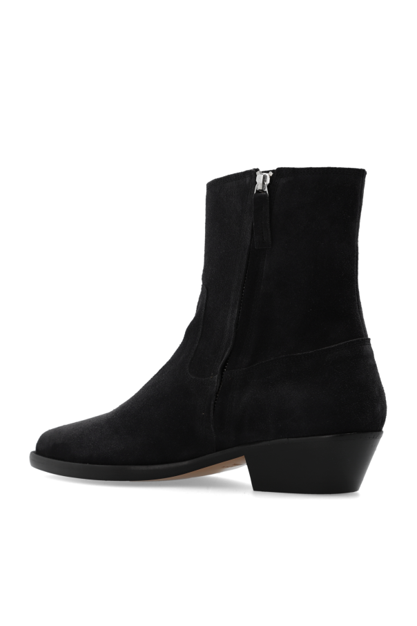 Navy ‘Okuni’ heeled ankle boots from MARANT. Crafted from suede, this pair features a side zip and a brown leather sole.