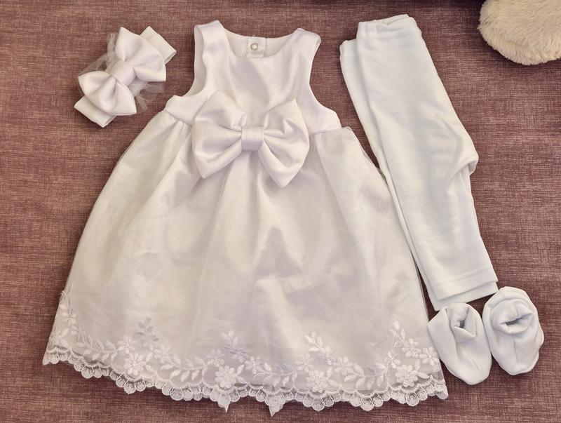 Красивый и праздничный набор для крещения, облаченный один раз, может быть и в качестве праздничной одежды. Купила значительно дороже. Размер на наборе 62см но может быть и дольше, мы одевали на девочку 68см.