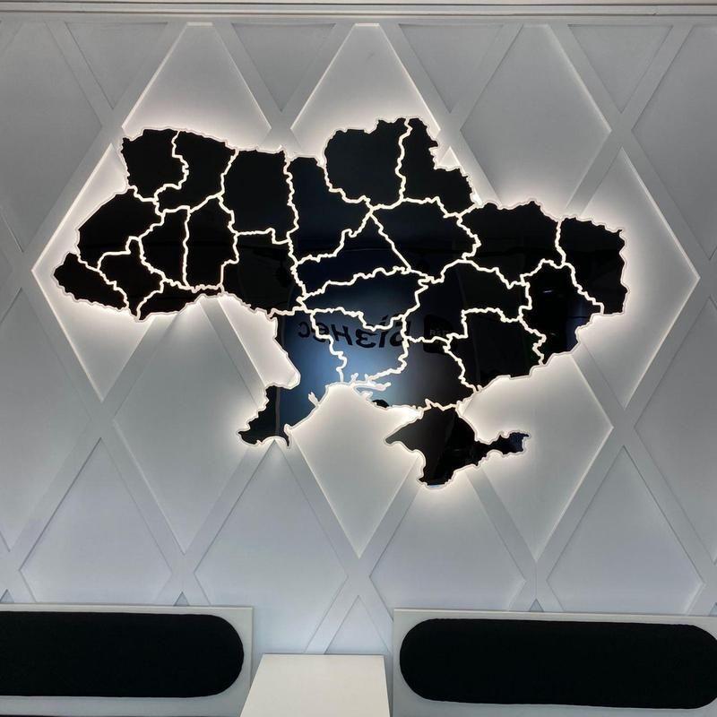 Карта України з поастика з плдсветкой по кожній області - це відмінне доповнення до Вашого інтер'єру, як для офісу, так і для дому. LED підсвічування по контуру кожної області-додає інтер'єру трохи чарівництва і затишку. Можемо виготовити карту у Вашому корпоративному кольорі, зробити позначки філій компанії. Тип підключення карти: -до виведеним проводу з стіни; -в розетку. Підсвічування може бути теплою або холодною. У комплекті Ви отримаєте: Трансформатор, пульт регулювання підсвічування, інструкцію по установці і матеріали для кріплення. *Можемо виготовити карту у Вашому корпоративному стилі і нанести логотип компанії