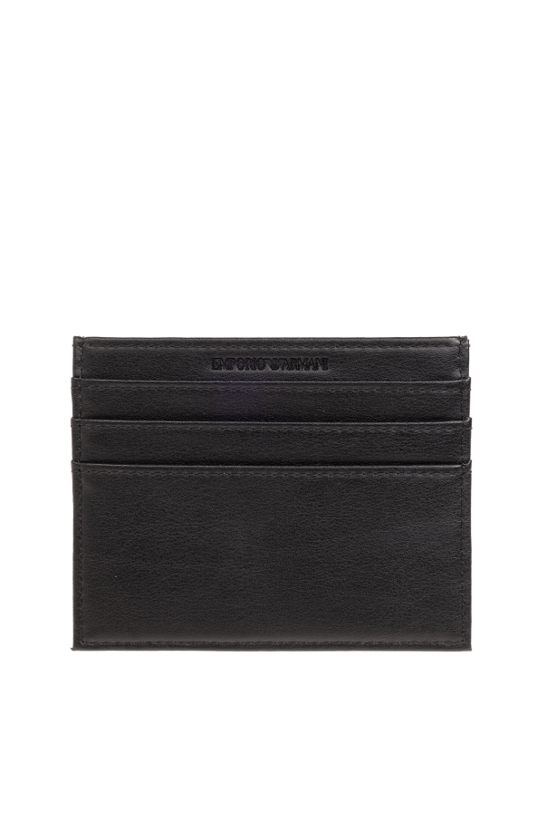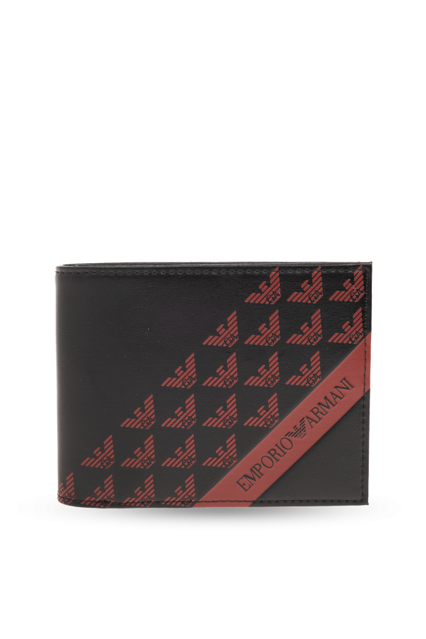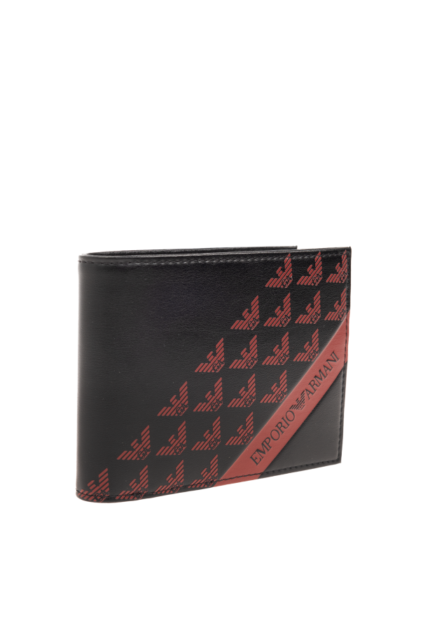 Black and red set from Emporio Armani. The wallet features four card slots, one snap-fastened pocket and one internal compartment with two slip pockets. The card holder has six card slots and one slip pocket.