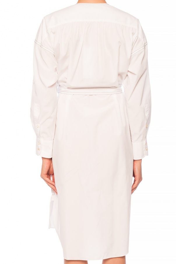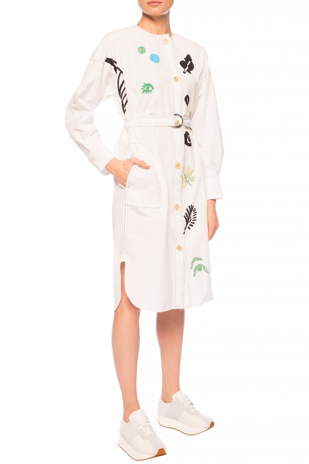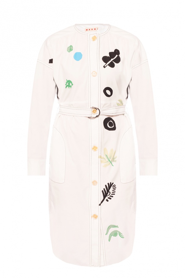 White dress with a belt from Marni. Made of cotton. Fastened with buttons. Decorated with a colorful print. Two slip pockets on the front. Round neck. Long sleeves.