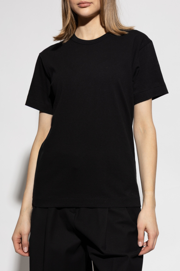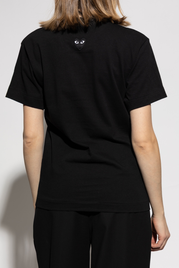 Introducing the Comme des Garçons Play T-shirt with Logo Appliqué from our exclusive collection, a sublime fusion of minimalist design and premium craftsmanship. Cloaked in a timeless black hue, this classic unisex tee, with its short sleeves and round neckline, is crafted from the finest quality cotton, ensuring unparalleled comfort and durability. The pièce de résistance is the distinctive heart-shaped appliqué with eyes, subtly positioned at the upper back, which imparts a unique character and serves as the brand\'s iconic hallmark. This T-shirt is a testament to understated luxury, perfect for those who appreciate subtle details and superior quality. Why Choose This Product? Exquisite design from Comme des Garçons Play, a line renowned for its youthful and whimsical style. Made from high-quality cotton for comfort and longevity. Features the iconic heart logo, adored by celebrities and fashion enthusiasts alike. Effortlessly versatile, making it an essential addition to any wardrobe.