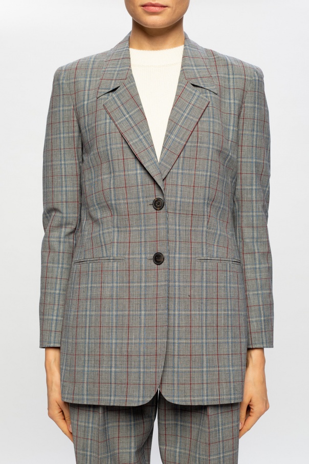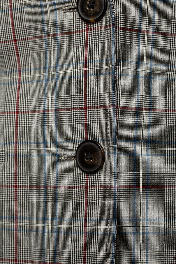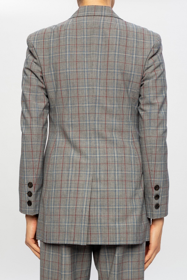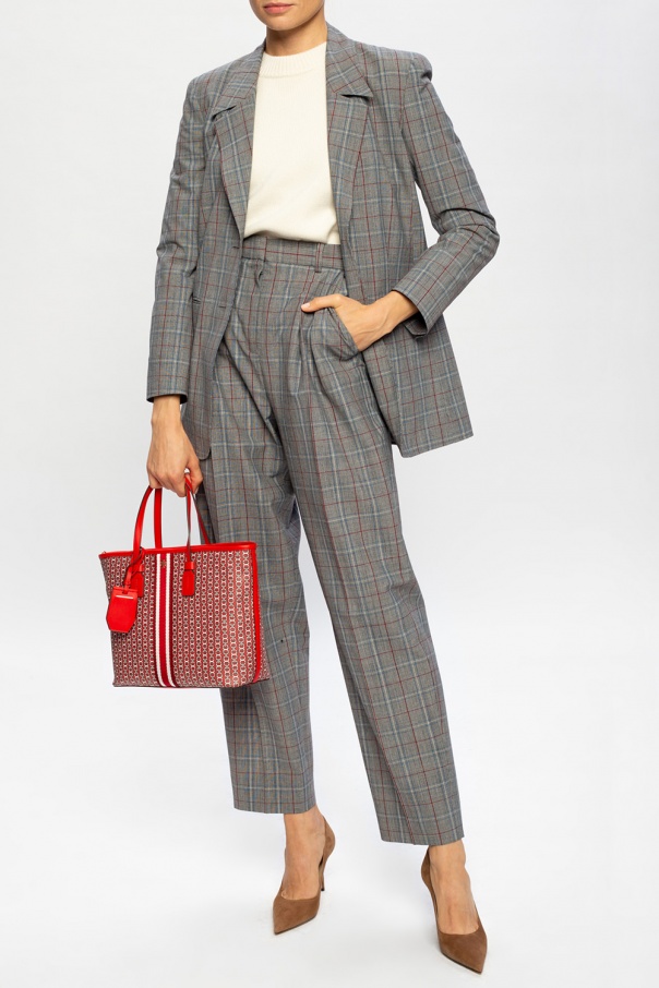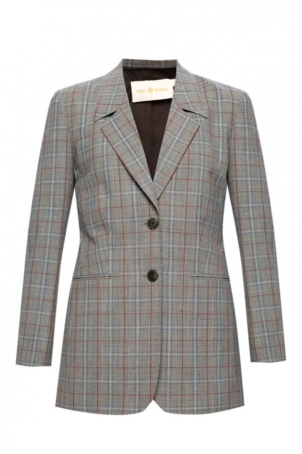 Grey blazer from Tory Burch. Rendered in red, black and blue checked pattern, this garment fastens via buttons and employs notched lapels and two jetted pockets on the front.