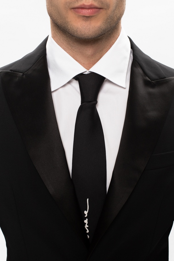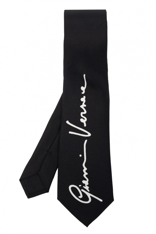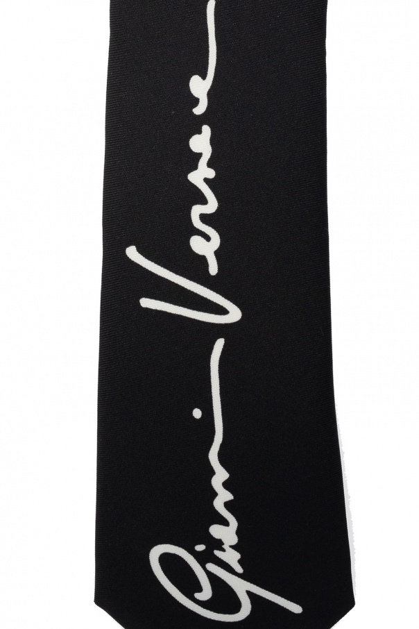 Black tie from Versace. Crafted from silk, this design features a white logo.