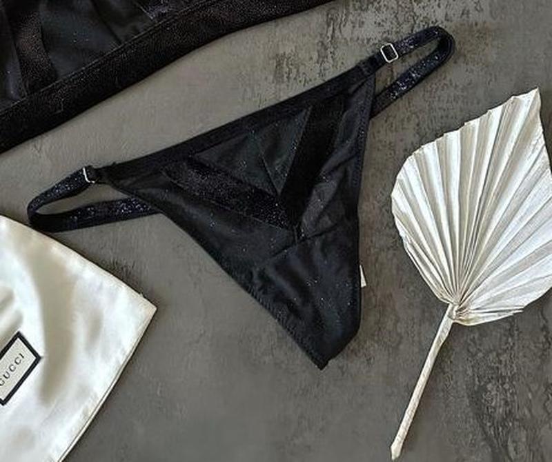 Неймовірно вишуканий комплект білизни від Intimissimi з лімітованої серії UNDER THE STARS 🖤 Виконаний з тканини з оксамитовим геометричним візерунком і еластичної мікросітки, понизу оздоблений стрічкою з мережива. Глибокий чорний колір з срібним шимером🥰 • Бра модель Tiziana з трикутними, злегка ущільненими чашками, бічні кісточки злегка підтримують груди. Регульовані бретелі. Застібається ззаду на 3 гачки з чотириступеневим регулюванням окружності, в розмірі 75В. Трусики бразиліано/стрінги, розмір ONE SIZE, регулюється на розмір S, M, L. Внутрішня ластовиця зі 100% бавовни.