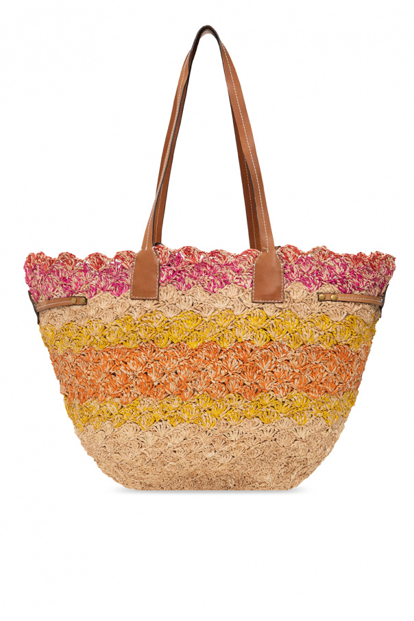 Multicoloured ’Coiba’ shopper bag from Isabel Marant. Handcrafted from raffia and trimmed with brown leather, this design features a logo patch on the front, four half-round handles (two short ones and two long ones), gold-tone metal hardware and one internal compartment. The model was created as part of the brand\'s cooperation with the \'INITIATIVES\' organization, which employs artisans from Madagascar and helps to finance health care and education for their families.