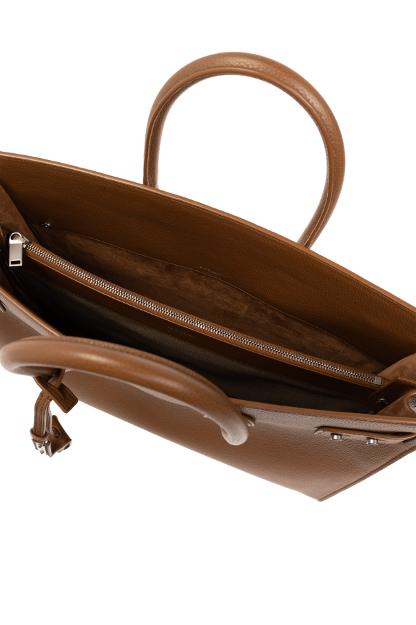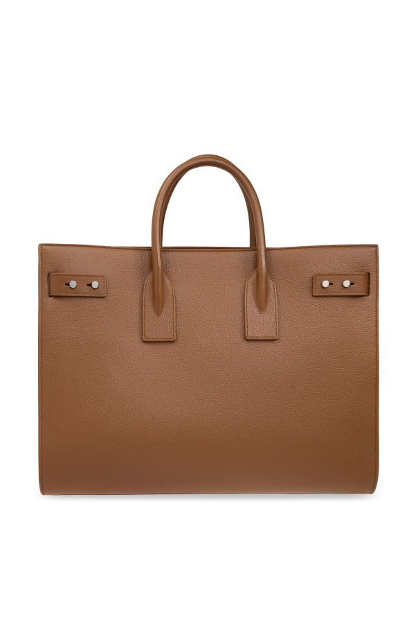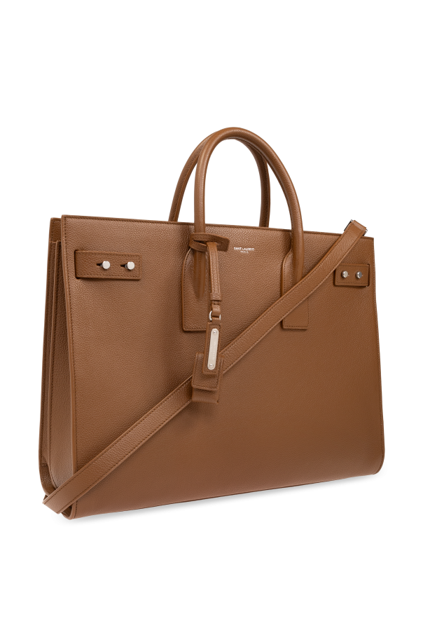 Introducing the ‘Sac De Jour Large’ Shoulder Bag by Saint Laurent, a paragon of exquisite craftsmanship and understated elegance. Rendered in a rich brown hue, this rectangular-shaped bag is meticulously crafted from smooth calfskin leather, offering a tactile experience that is both luxurious and enduring. Its flat bottom ensures stability, allowing the bag to stand with grace. The front of the bag is adorned with two flat strips, serving both an ornamental and functional purpose, potentially for the attachment of additional accessories. It features a pair of rounded handles for hand carriage and a detachable, adjustable shoulder strap, enhancing its versatility and offering various modes of carrying. The metal hardware, including buckles and clasps, is finished in silver, complementing the bag\'s overall aesthetic. While devoid of overt logos or designer inscriptions, the bag\'s superior craftsmanship hints at its exclusivity and designer origin. It’s devoid of embellishments, directing focus towards its minimalist design and the quality of the material. A discreet silver logo on the front, accompanied by a lock and logo charm, subtly brands the piece as unmistakably Saint Laurent. The interior reveals a compartment with a detachable zippered pocket, adding to its functionality. Why Purchase This Product? Elegant design with a focus on minimalist aesthetics and functionality. Constructed from high-quality, smooth calfskin leather for durability and luxury. Offers versatile carrying options with both hand and shoulder straps. Subtle designer branding, including a silver logo and charm, indicating exclusivity. Interior compartment with a detachable pocket for organized storage.