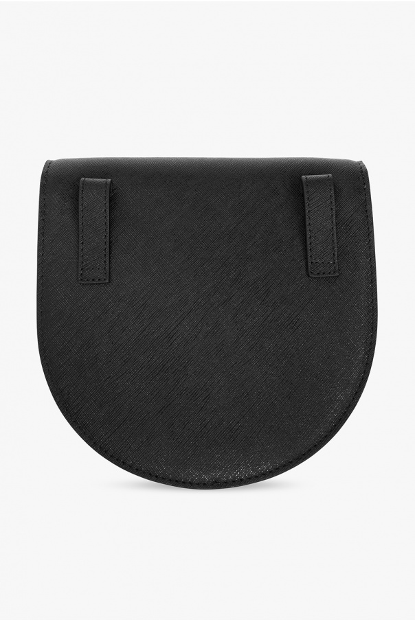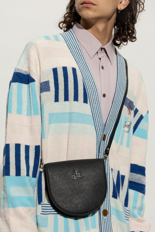 Black ‘Sarah’ shoulder bag from Vivienne Westwood. Made of patent calf leather, this model fastens with a magnetic snap and is decorated with a studded metal logo appliqué. It has leather belt loops at the back – can be worn as a belt bag, as well as a detachable and adjustable strap, silver-tone metal hardware and one internal compartment with one slip pocket.