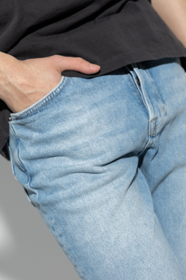 Light blue ‘Cigarette’ skinny fit jeans from AllSaints. Fastened with buttons, this design features a brown logo patch at the back, three front pockets, two back pockets and cropped, tapered legs.