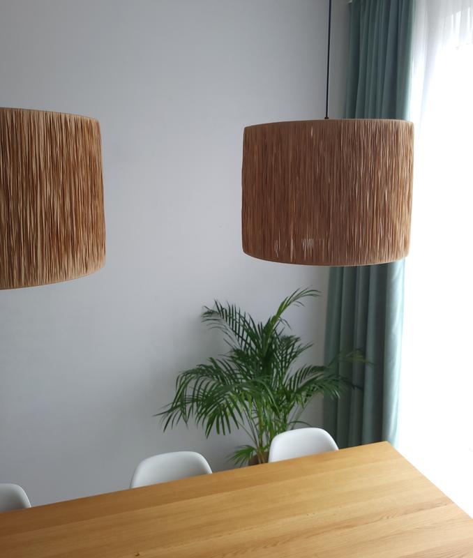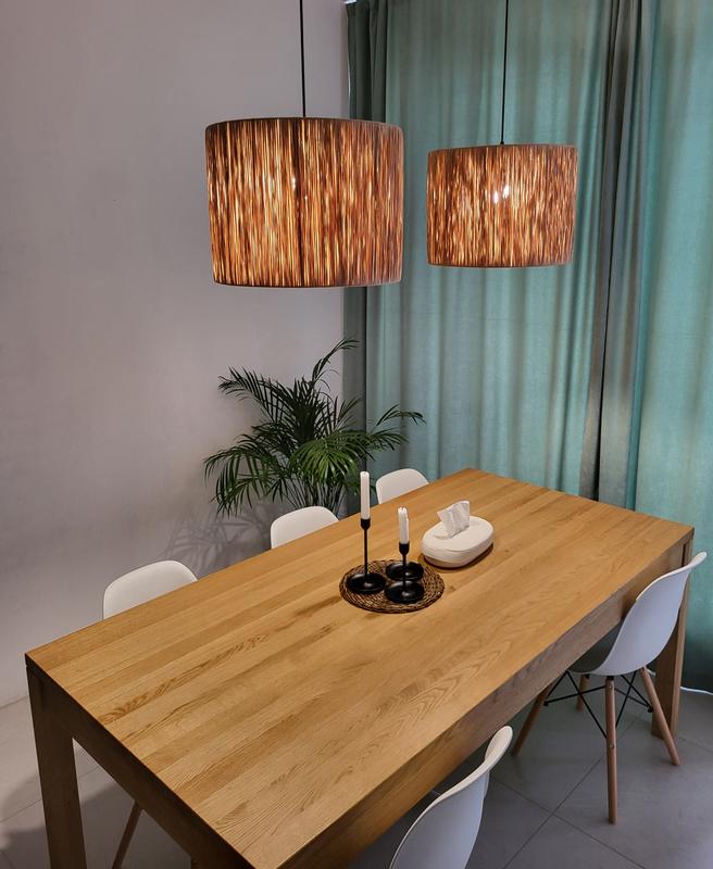 Проміні світла гарно проблизкують через слої рафії, основне світло падає на поверхню під люстрою, що робить її ідеальною в їдальні або затишних кутках оселі, де не потрібно багато яскравого світла.Натуральні материали