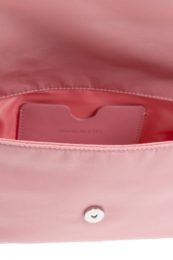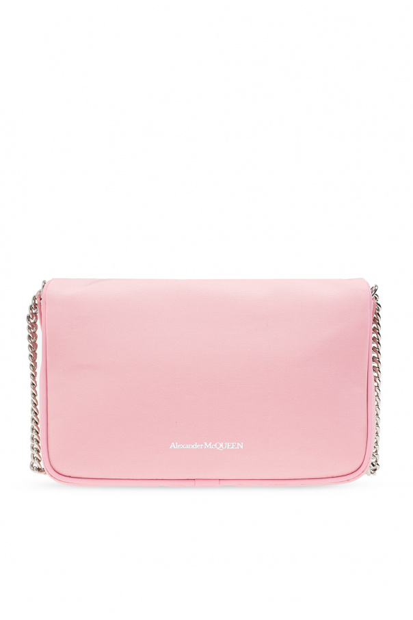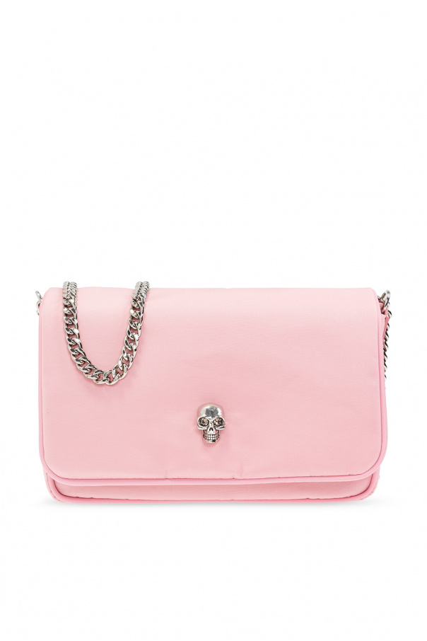 Pink\'Skull Small\' shoulder bag from Alexander McQueen. Fastened with a snap, this design features the brand’s signature skull embellished with Swarovski crystals, chain strap, silver-tone metal hardware and one internal compartment with one card slot.