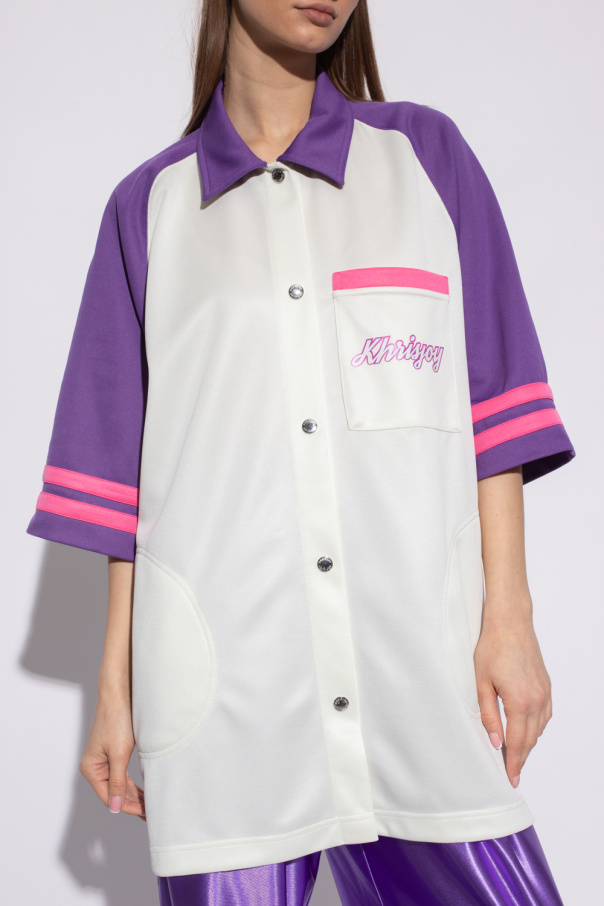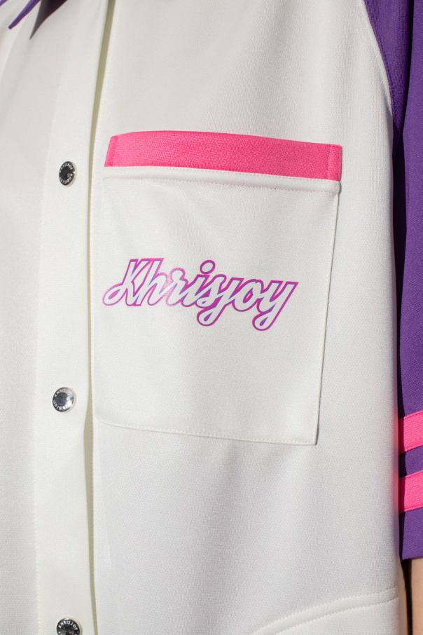 Cream, purple and pink shirt from Khrisjoy. Embellished with a logo pattern, this style features snap fastenings, three slip pockets and short sleeves.