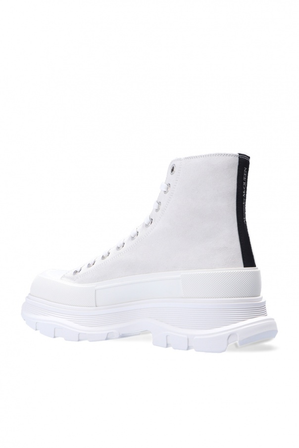 White sneakers from Alexander McQueen. Crafted from leather, this lace-up pair boasts a high-top silhouette with rubber finishes, a white rubber sole at the base and the brand\'s logo rendered in print, embossing and embroidery.