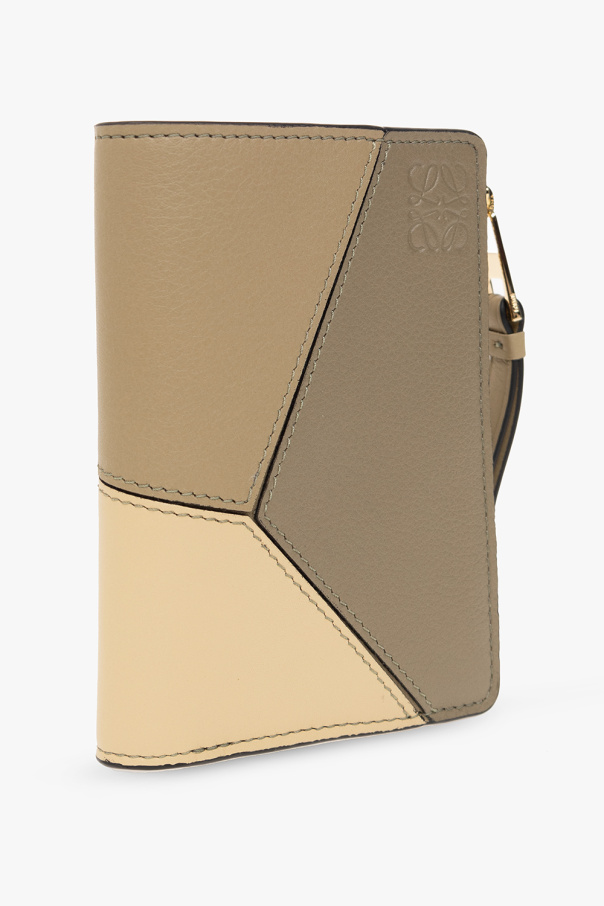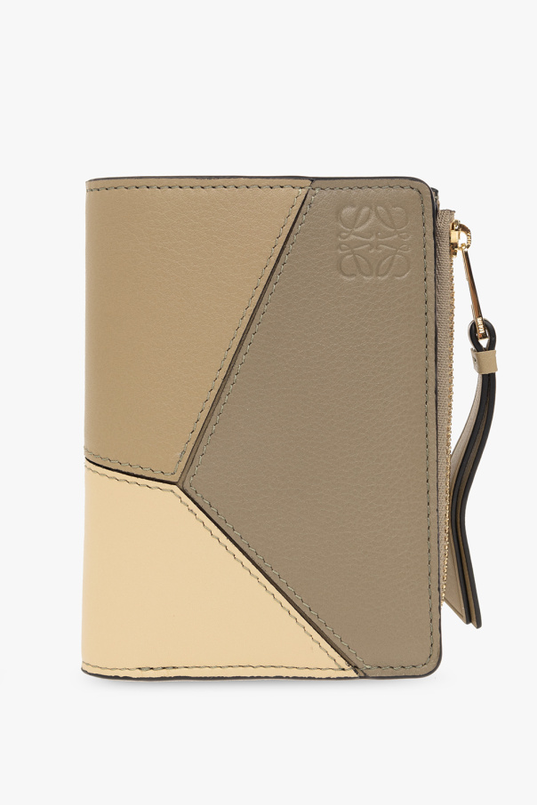 Green, grey and cream wallet from Loewe. Made of leather, this design fastens with a snap and showcases an embossed logo pattern, gold-tone metal hardware and six card slots, two slip pockets and a zipped coin gusset inside.