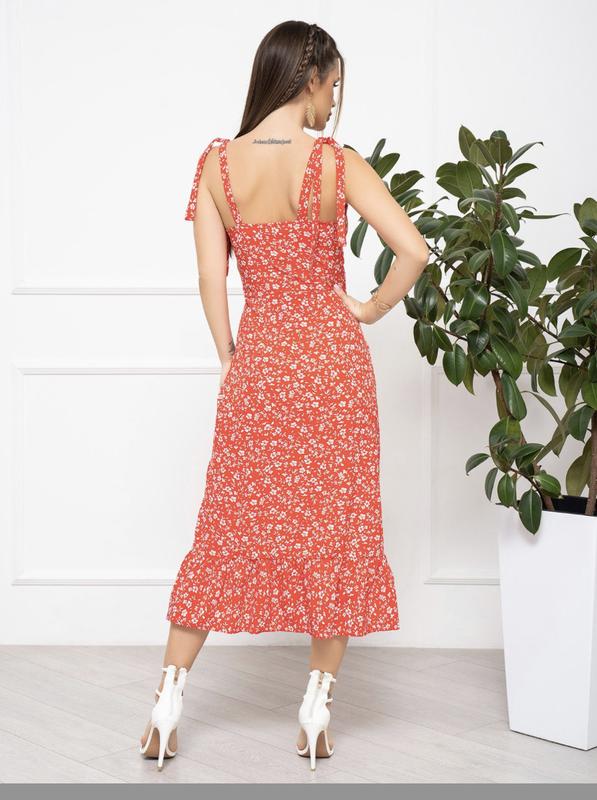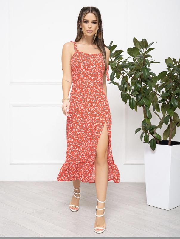 Повседневный сарафан, выполненный из цветочного красного софта. Изделие с застежкой-молнией и нижним воланом. Модель прямого кроя с бретелями-завязками и боковым разрезом на ноге.