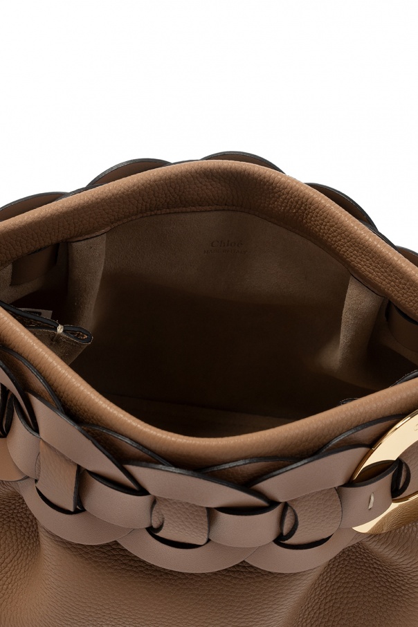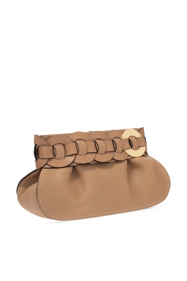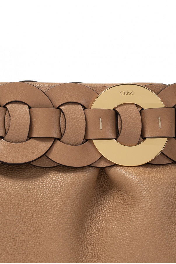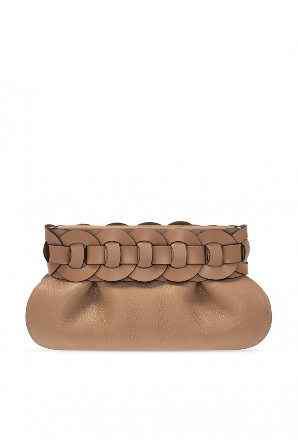 Light brown ‘Darryl’ clutch from Chloé. Crafted from textured leather, this design features a magnetic snap fastening, decorative strap, logo-embossed appliqué in gold-tone and one internal compartment.