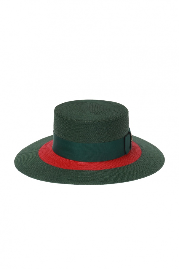 Hat featuring the 'Web' motif in green, red and green from Gucci. Decorated with a green grosgrain stripe featuring a bow. Enriched by a metal inlay in the shape of the brand's signature bee in antiqued gold-tone.