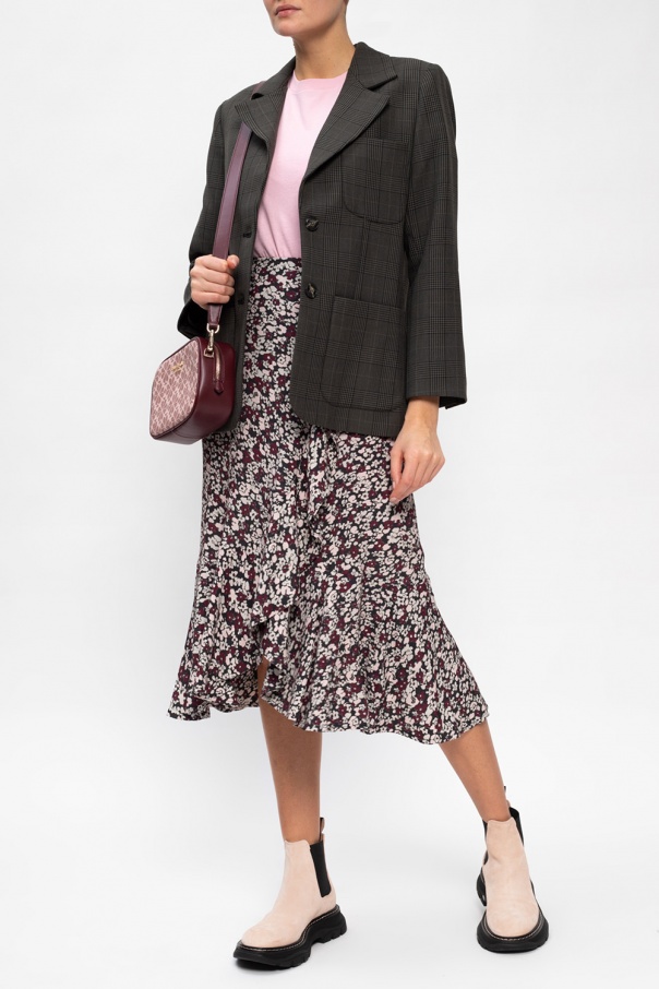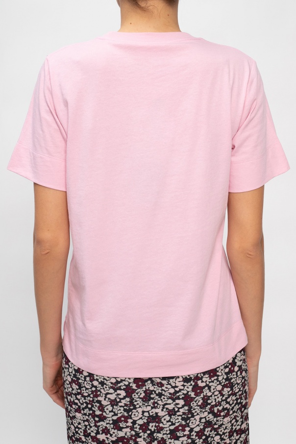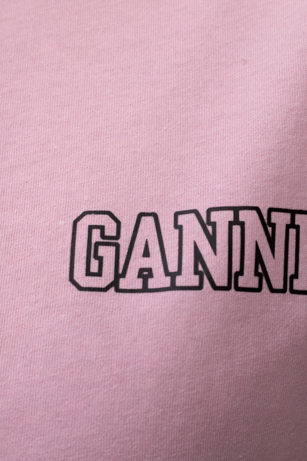 Pink crewneck T-shirt from Ganni. Crafted from jersey fabric, this style features an elasticated collar and black graphic print with the brand\'s logo.