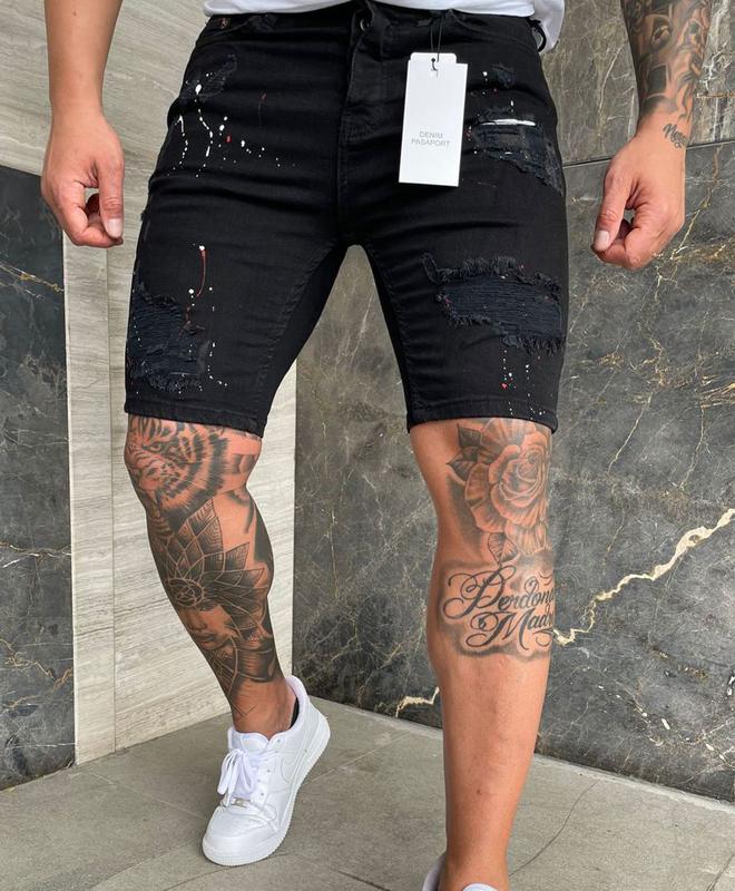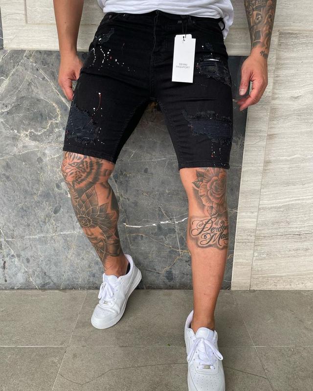 Мужские шорты джинс, потертые с красно-белыми пятнами краски