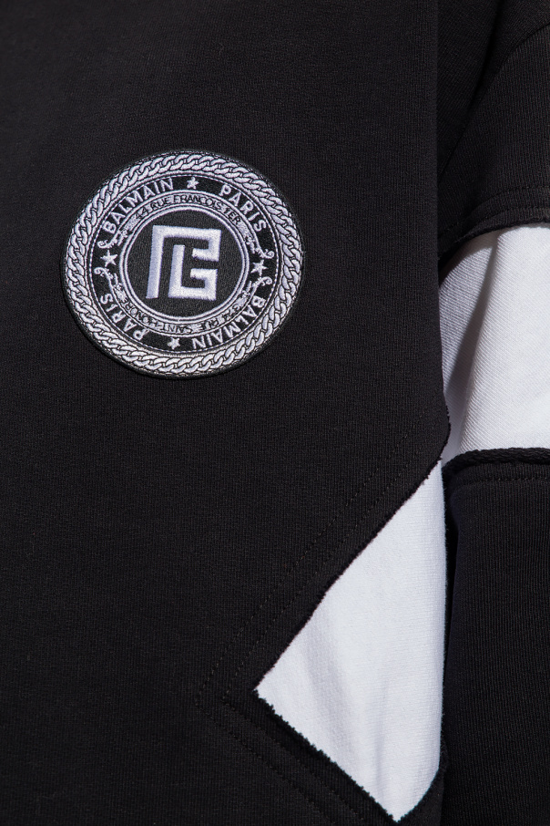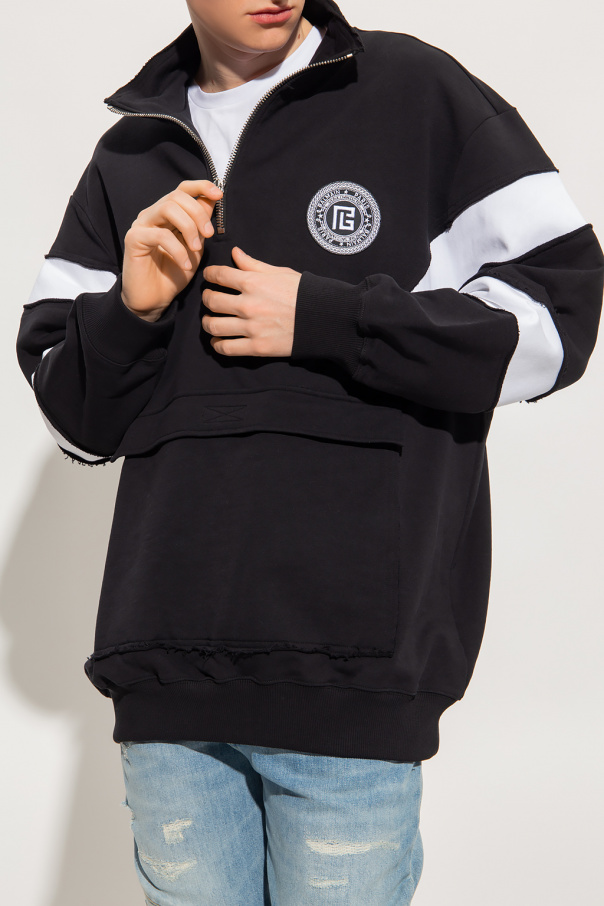 Black and white sweatshirt with a standing collar from Balmain. Crafted from cotton, this style features a zip fastening, one velcro-fastened pocket, an elasticated bottom hem and cuffs and a logo patch for brand recognition.