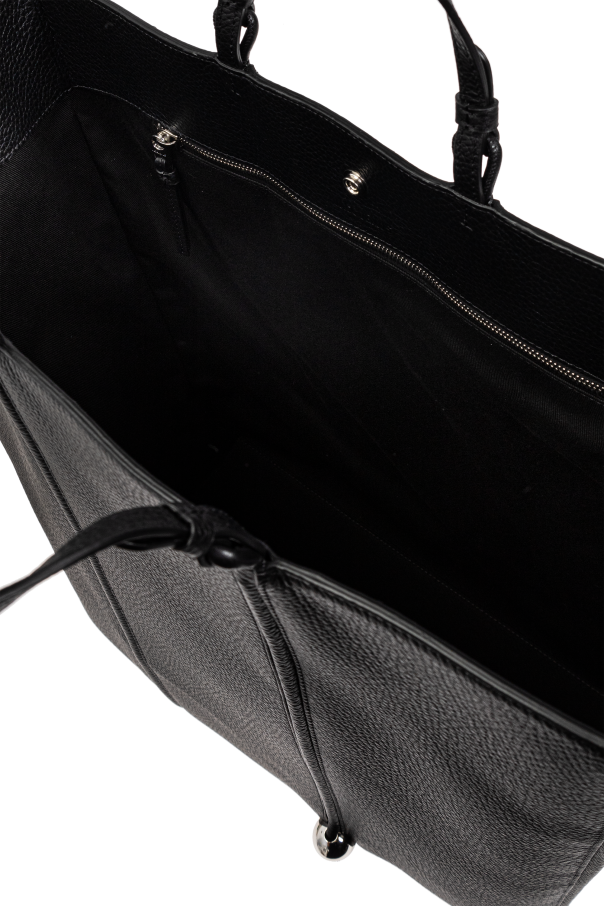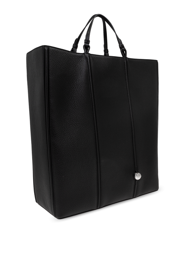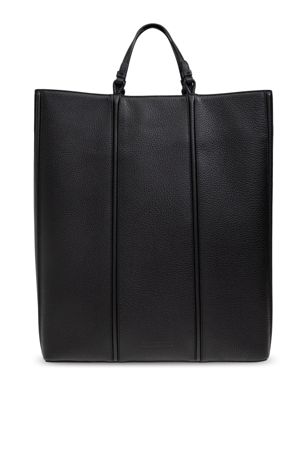 Introducing the Le Cabs Marino, an exquisite black shopper bag from the exclusive collection of the renowned fashion house, Jacquemus. Crafted with precision, this bag embodies a harmonious blend of modernity and timeless elegance. Designed in a sleek, rectangular silhouette, the bag\'s geometric form lends it a contemporary allure, while its generous size makes it the quintessential accessory for daily endeavors. Meticulously fashioned from premium pebbled calf leather, it promises both sophistication and durability. Adorned with a subtle vertical strap, culminating in a silver circular detail, possibly the designer\'s emblem, it showcases an understated elegance. Equipped with two short handles, it is designed for hand-carry ease. The interior, lined with a dark fabric, features a zippered pocket, enhancing its practicality. Dlaczego warto kupić ten produkt? Exquisite design by the visionary Simon Porte Jacquemus. Luxurious pebbled calf leather construction. Spacious interior with secure zippered pocket. Effortless blend of elegance and functionality.