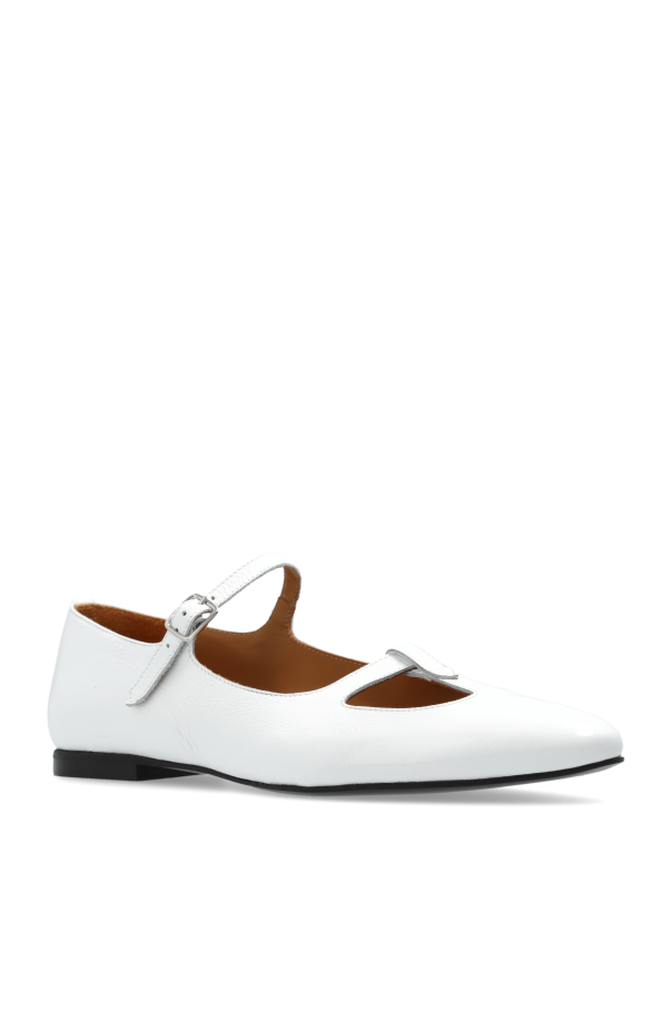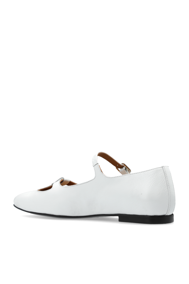 Introducing the \"Katie\" Ballet Flats by A.P.C., an embodiment of minimalist elegance and refined craftsmanship. These exquisite flats, presented in a pristine white hue, are a testament to timeless style and versatility. Crafted from 100% high-quality leather, the \"Katie\" flats boast a smooth, uniform surface that highlights the material\'s durability, comfort, and sophisticated appeal. The design features a pointed toe that lends a sleek and sophisticated silhouette, reminiscent of classic styles that seamlessly transition from everyday wear to more formal occasions. Unique details such as dual cutouts atop and a mid-foot strap with buckle not only serve as decorative enhancements but also offer practical benefits like additional ventilation and a customizable fit. The interior of the shoe reveals a lining in a contrasting shade, likely a rich brown or beige, adding an intriguing visual contrast. The flat sole ensures ultimate comfort and ease of movement, making the \"Katie\" ballet flats a perfect blend of function and aesthetic pleasure, characteristic of exclusive collections from renowned designers like A.P.C. Why Choose the \"Katie\" Ballet Flats? Timeless elegance with a versatile white color that matches any outfit. Exquisite craftsmanship from 100% high-quality leather for durability and style. Unique design with practical features for enhanced comfort and fit. Signature A.P.C. minimalism that elevates any wardrobe.