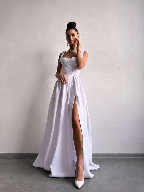 Біла сукня бʼюстьє, сукня з імітацією корсету, біла сукня максі, довга біла сукня на розпис, спідничка з розпоркою , яка ефектно виглядатиме на фотках. Гарно сідає по фігурі , збоку застібається на замочок.