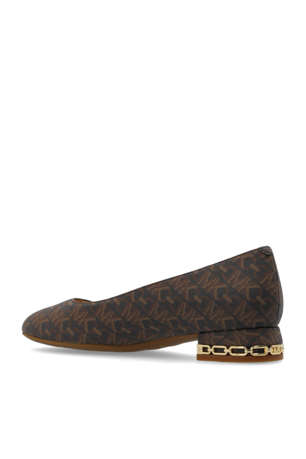 Introducing \"June\" - a distinguished creation from the exclusive collection by Michael Michael Kors. These women\'s flats embody elegance, merging classic style with modern allure. The classic shape with a rounded toe offers a timeless silhouette, while the intricate monogram pattern in shades of brown envelops the shoe in luxury. Crafted from matte material, which mimics the sophisticated texture of leather, these shoes are both stylish and practical. The outer layer, made of 100% canvas, complements an interior of 100% leather, ensuring comfort that matches their exquisite appearance. The design is further enhanced by a golden metallic chain or decorative element on the side of the heel, adding a touch of elegance and refinement. The dominant brown hues, accented with gold, speak to the shoe\'s upscale design, while the lighter interior suggests a commitment to comfort and high-quality finishing. The presence of the brand\'s signature on the insole is a hallmark of luxury, confirming the exclusiveness of the \"June\" flats. Why Purchase These Shoes? Exclusive Design: Classic style with unique monogram pattern sets these shoes apart. Luxurious Materials: High-quality canvas exterior and leather interior for ultimate comfort. Elegant Details: Golden accents and decorative elements add a sophisticated touch. Comfort and Quality: Designed for elegance without compromising on comfort.