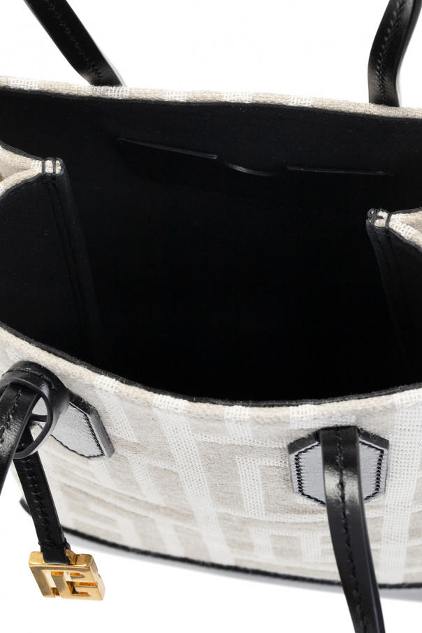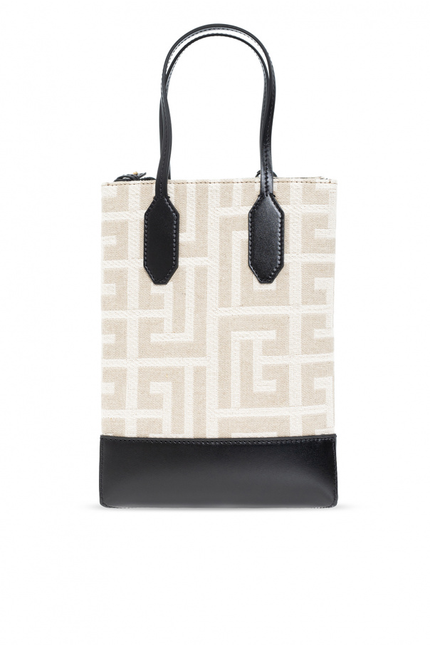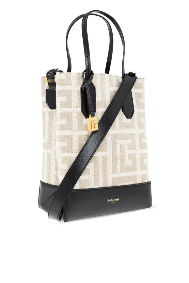 Grey, cream and black shopper bag from Balmain. Crafted from monogrammed canvas, this design features calf leather trims, a gold-tone logo print on the front, a logo-shaped application, two half-round handles, an adjustable strap, gold-tone metal hardware and one internal compartment with a card slot.