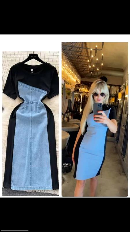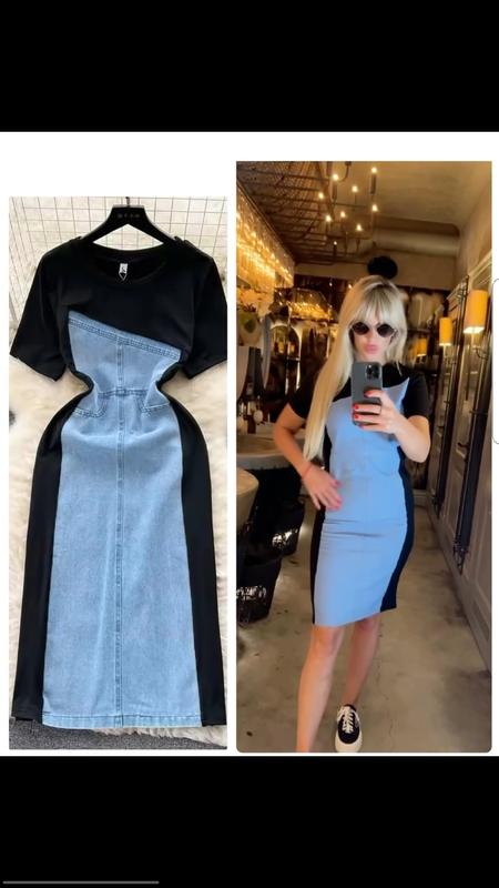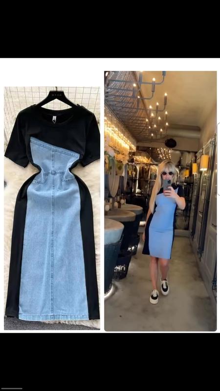 Матеріал: Верхня частина сукні виконана із чорного трикотажу, а основна частина – із світло-синього джинсового матеріалу.