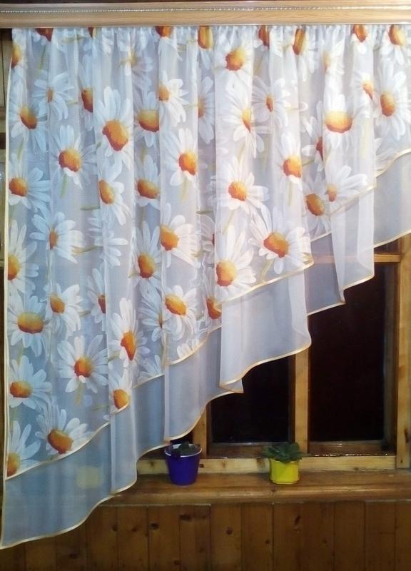 Кухонная занавеска изготовлена из шифон белого цвета и органза принт ромашка.