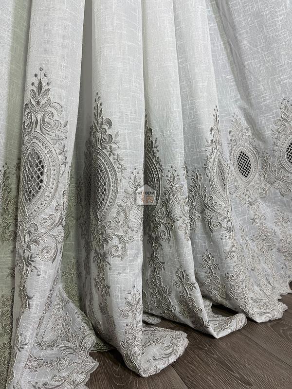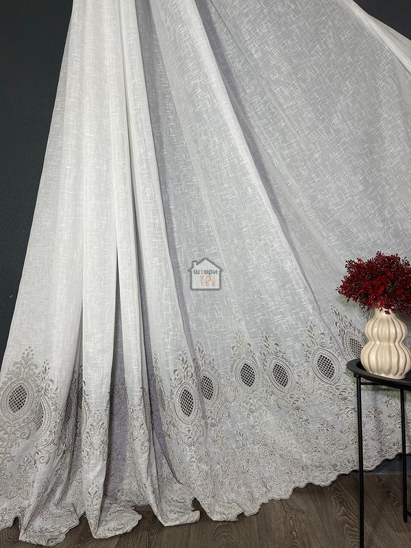 3. Естественная текстура. Тюль из льна с серым низом имеет приятную текстуру, которая добавляет шарм и элегантность в интерьер. Он также обладает хорошей проходимостью воздуха, что позволяет воздуху свободно проникать в комнату. Это создает ощущение легкости, а также помогает поддерживать комфортный микроклимат.Ткань для тюля лен с вышитым узором будет удачным элементом для украшения