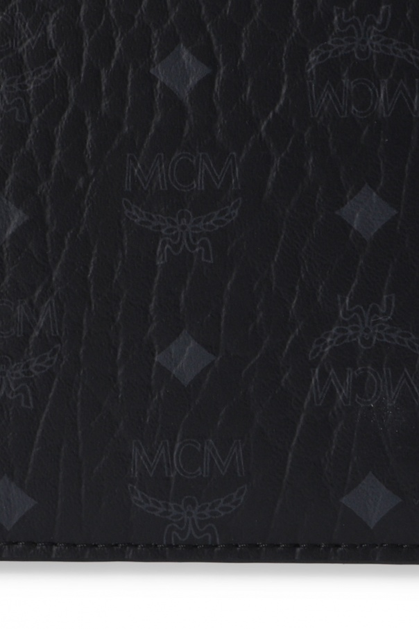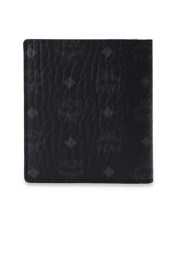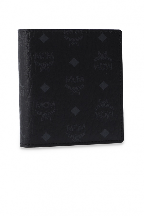 Black bifold wallet from MCM. Decorated with a grey logo print, this item has a bill compartment and eight card slots inside.