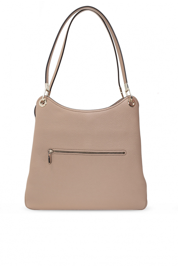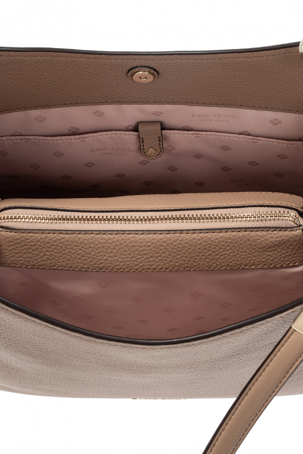 Beige shoulder bag from Kate Spade. Crafted from leather, this design fastens with a magnetic closure and is decorated with a metal logo. It is complete with a back zip pocket, two half-round straps, detachable tassel, gold-tone metal hardware and three internal compartments with multiple pockets.