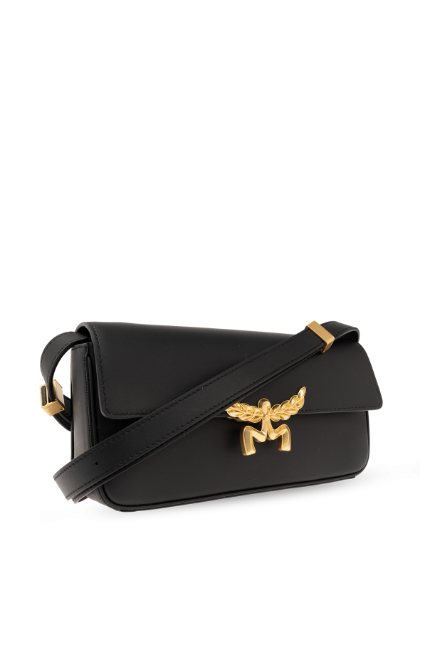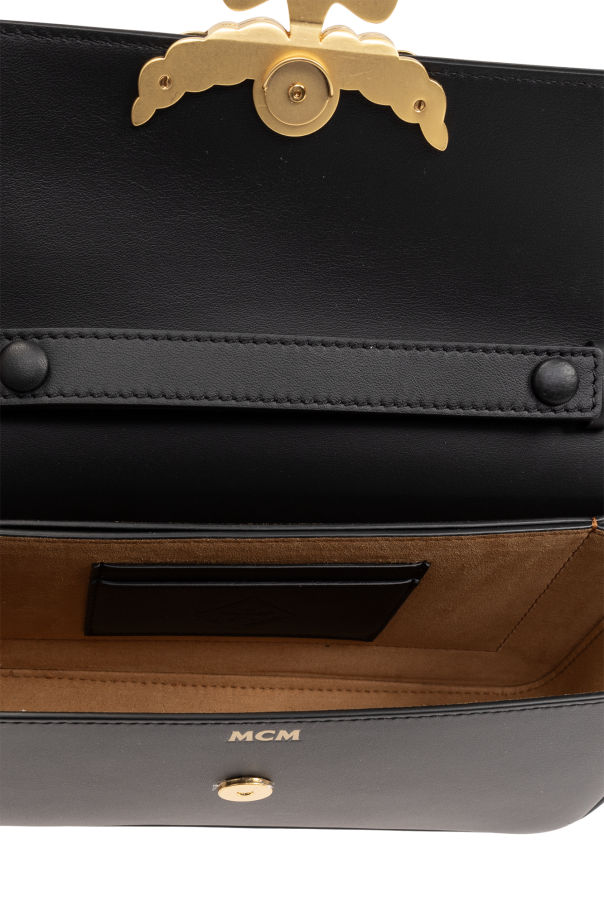 Introducing the \'Himmel\' shoulder bag from our exclusive collection, crafted by the illustrious designer MCM. This piece is the epitome of sophistication, boasting a sleek, black hue that exudes elegance. The classic, rectangular silhouette with rounded edges is meticulously designed for the modern connoisseur, while the bag\'s surface, reminiscent of calfskin leather or a high-quality synthetic alternative, offers a smooth, luxurious feel. The \'Himmel\' bag is defined by its absence of pattern, embracing a minimalist aesthetic that is both timeless and chic. Gold accents, including an ornate logo shaped like the letter \'M\' with wing-like adornments, lend an air of exclusivity and recognition to this exquisite accessory. A matching black, adjustable shoulder strap with golden embellishments enhances the cohesive allure of the design. The flap closure, secured by a golden magnetic clasp, reveals an interior lined in a sumptuous brown fabric, complete with an additional inner pocket for your essentials. Noteworthy details such as the engraved brand logo inside the bag underscore its exclusive pedigree. The close-up of the clasp showcases the precision craftsmanship and quality of the golden detail, making the \'Himmel\' bag a masterpiece of design and functionality. Why Purchase This Product? Elegance and Sophistication: A minimalist design with luxurious accents for a timeless appeal. Exquisite Craftsmanship: High-quality materials and meticulous attention to detail. Exclusive Design: Unique gold details and an iconic logo for distinguished style. Functionality: Adjustable strap and practical interior with additional pocket for convenience.