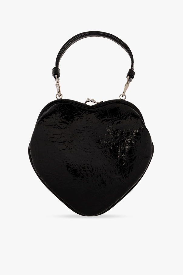 Black ‘Belle Heart’ heart-shaped shoulder bag from Vivienne Westwood. Crafted from faux leather with a crinkled effect, this design fastens with a snap and features a metal logo plaque on the front, detachable handle and chain strap, silver-tone metal elements and one internal compartment.