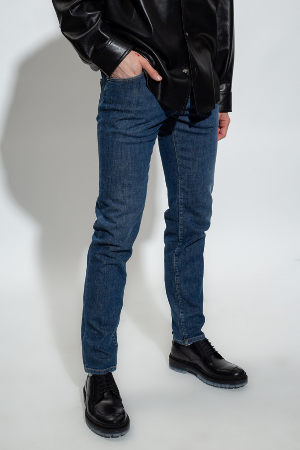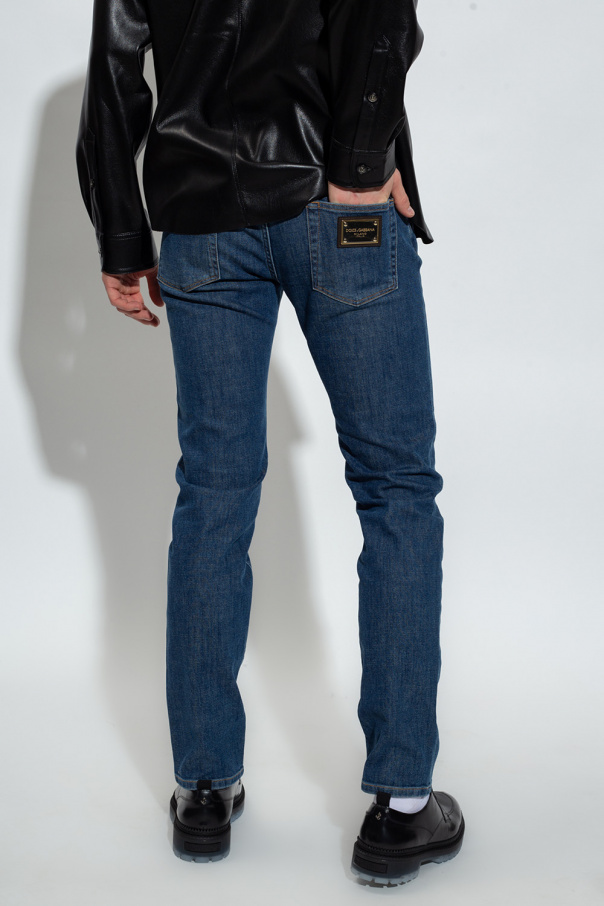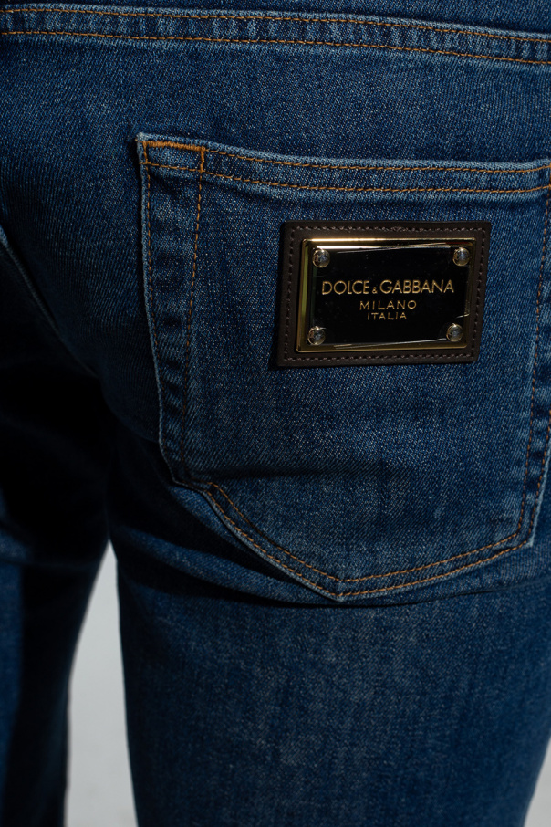 Blue skinny jeans from Dolce & Gabbana. Fastened with a zip and button, this pair features a brown, gold-tone and silver-tone metal logo patch, three front pockets and two back pockets.