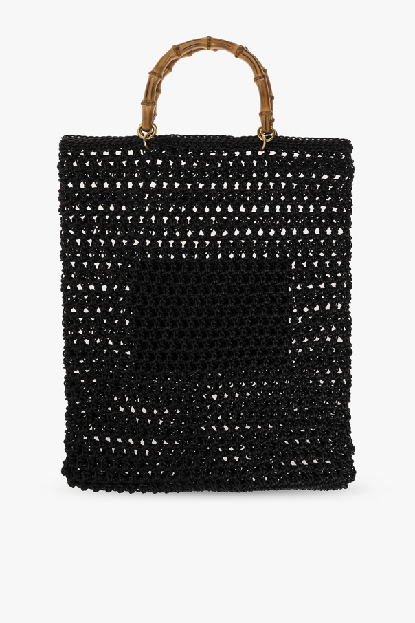 Black woven shopper bag from Jil Sander. Crafted from cotton and leather, this model features a logo-embossed front pocket, two half-round bamboo handles, one internal compartment and gold-tone metal hardware.