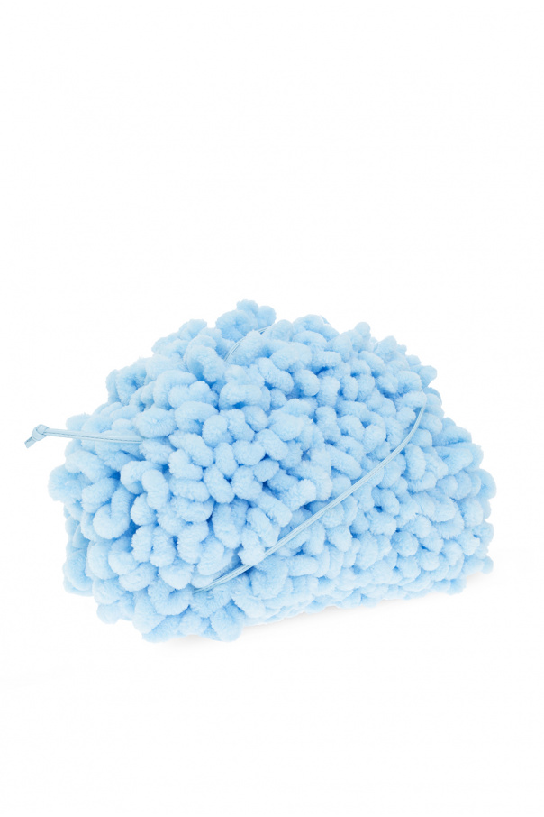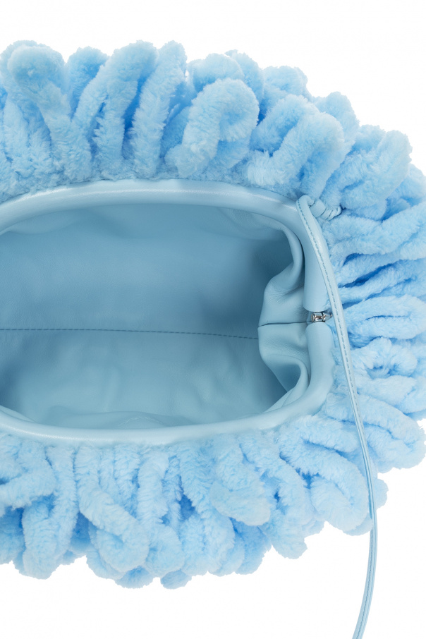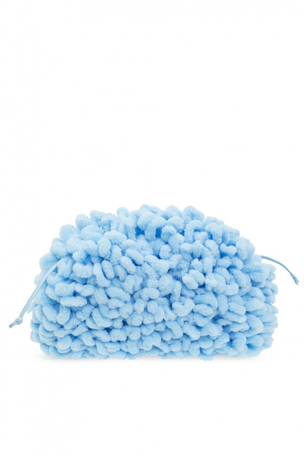 Blue ‘Pouch Mini’ shoulder bag from Bottega Veneta. Crafted from twisted chenille elements, this model features a magnetic snap, shoulder strap with decorative knots and one internal compartment with lamb leather lining.