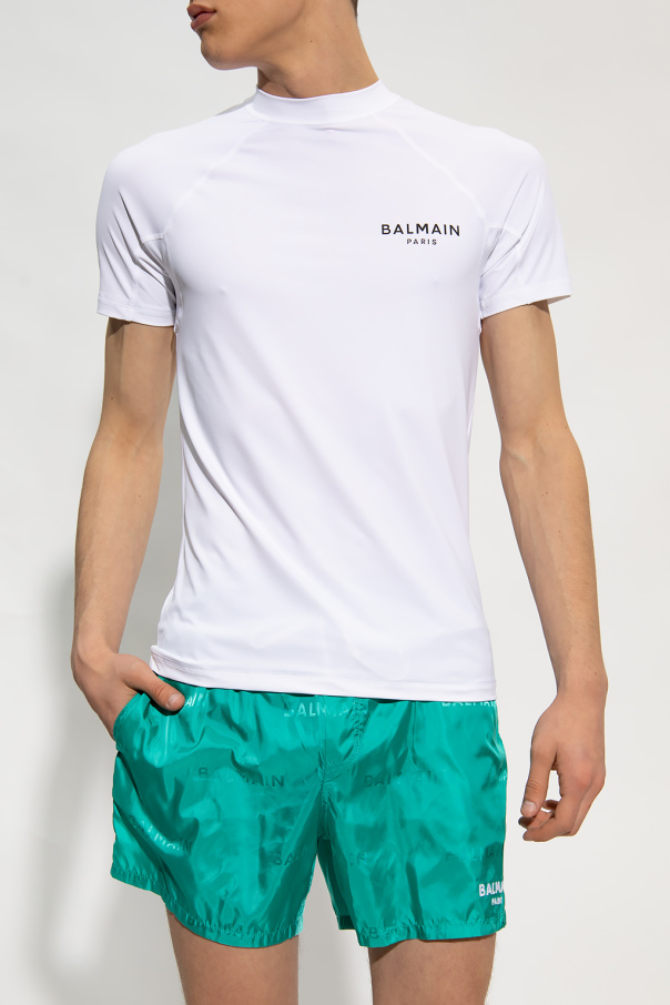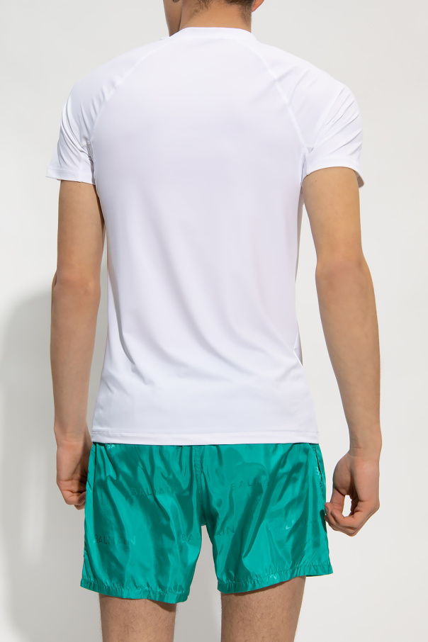White crewneck swim T-shirt from Balmain featuring a black logo on the front and short sleeves.
