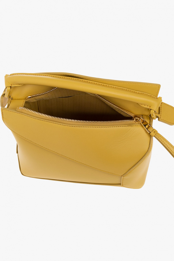 Yellow ‘Puzzle Small’ shoulder bag from Loewe. Crafted from calf leather, this model features a flap with an embossed monogram and zip, decorative asymmetric patches, back pocket, short handle, detachable and adjustable shoulder strap with embossed logo details, gold-tone metal hardware and one internal compartment with one slip pocket.