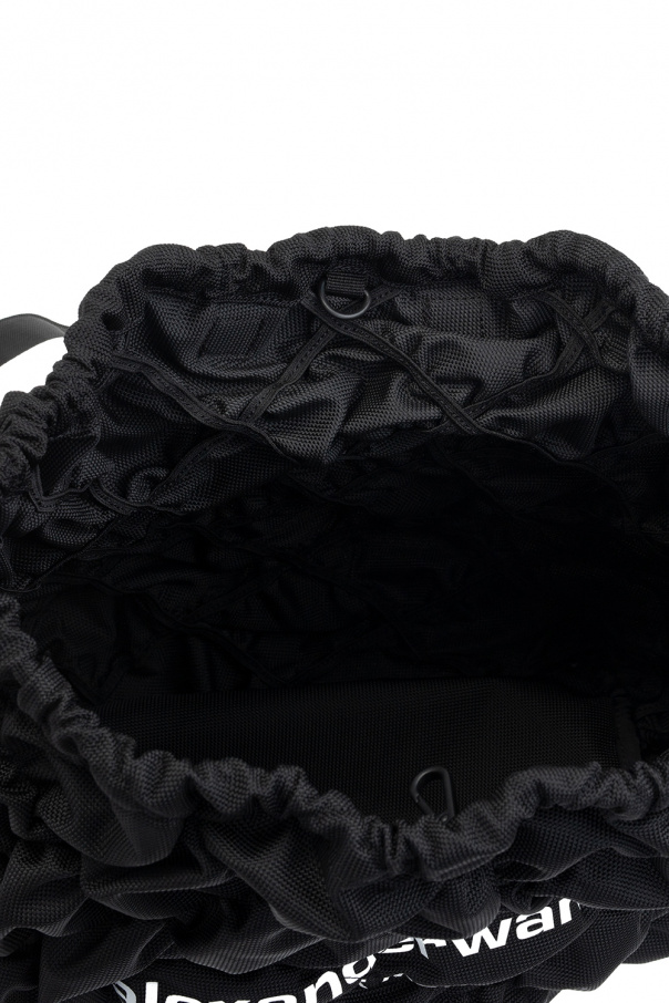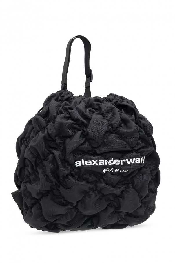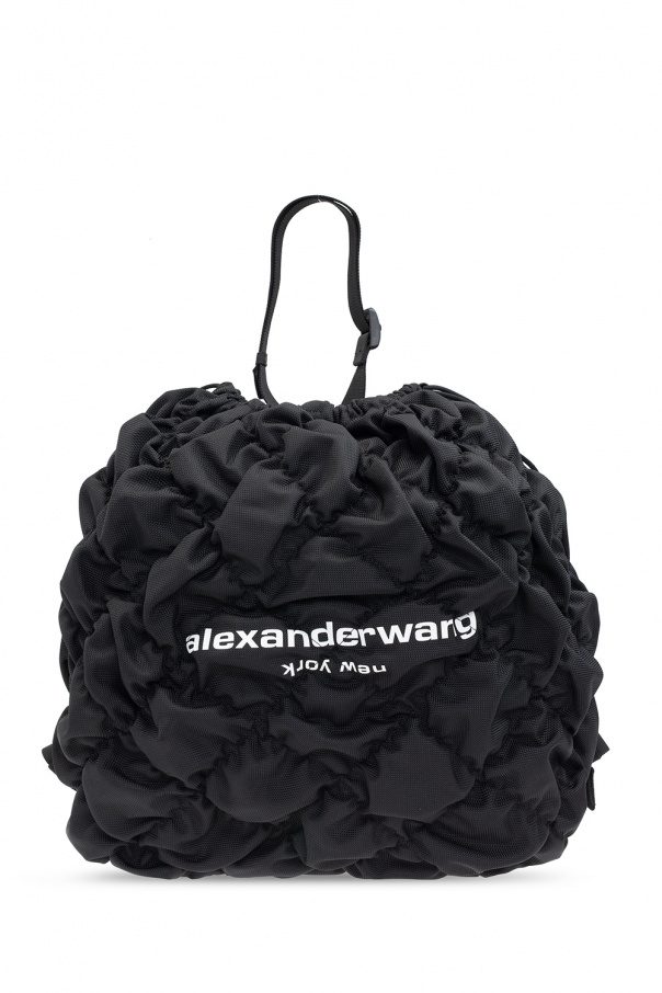 Black quilted backpack from Alexander Wang. Fastened with drawstrings, this design fastens with a buckle and is complete with a white logo print, one internal compartment as well as adjustable straps and handle.