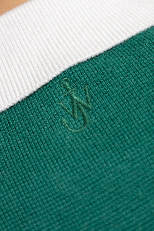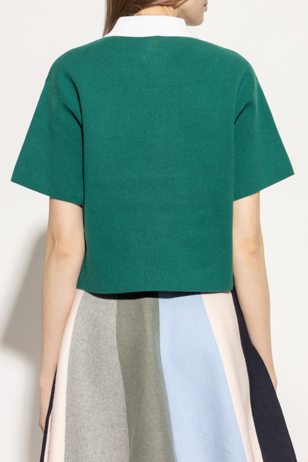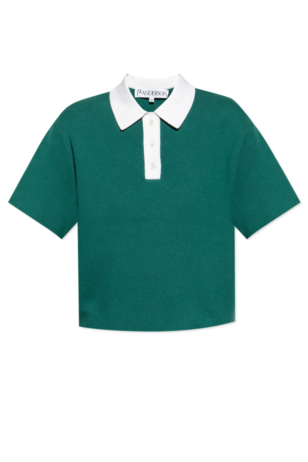 Introducing the Polo with Cashmere Finish by the illustrious designer JW Anderson. This exquisite piece showcases a harmonious blend of green and white, embodying the epitome of luxury and elegance. Crafted from a premium fabric blend, predominantly composed of cotton with a hint of elastane, it exudes a refined yet contemporary allure. The classic cut of this polo, featuring short sleeves and a contrasting white collar, accentuates its sophisticated design. A white button placket enhances its timeless appeal, while the meticulously embroidered logo adds a touch of exclusivity. This polo\'s versatility is unmatched, effortlessly pairing with various wardrobe staples, as exemplified by its pairing with a colorful skirt. Its simplicity and elegance make it an essential addition to any exclusive collection. Why Choose This Product? Luxurious cashmere finish for a premium feel. Classic design with contemporary details. Versatile styling options for any occasion. Unique design by the renowned JW Anderson.