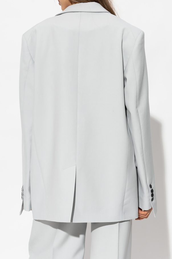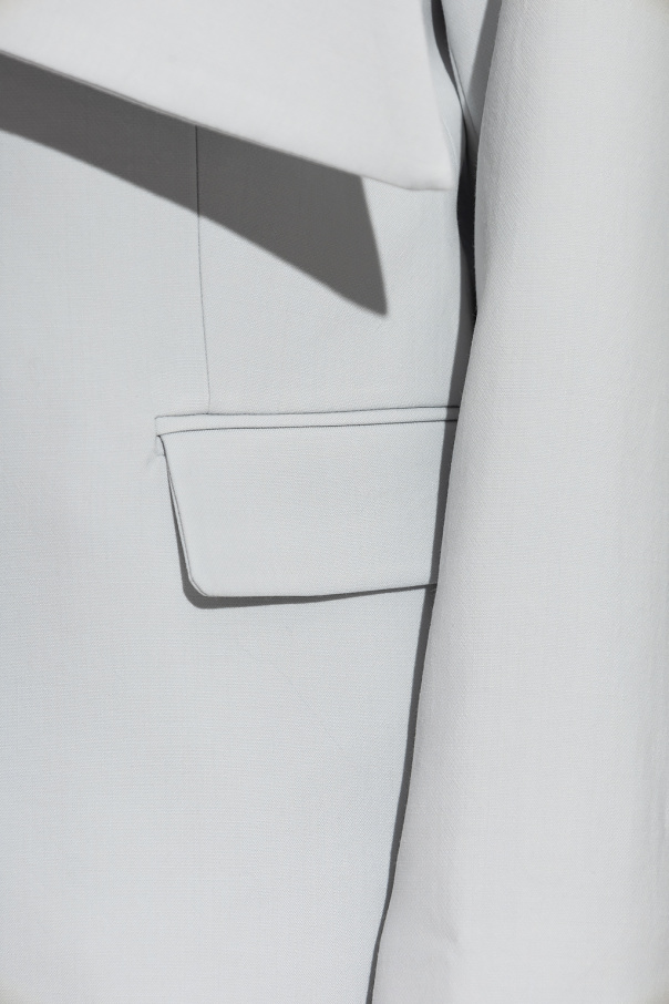 Greyish blue ‘Strike’ blazer from BITE Studios. Crafted from wool with an asymmetrical silhouette, this style fastens with a button and features two different lapels, two flapped pockets, long sleeves with button cuffs and a single back vent.