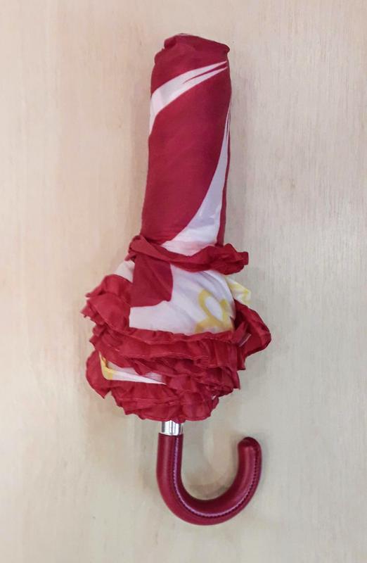 Механічний парасольку в 3 складання. Кромка куполи та чохол оздоблені рюшами, що додає особливий шарм. Зручна ручка обтягнута високоякісним синтетичним матеріалом кольору фуксії. Розмір в складеному вигляді: 29 див.