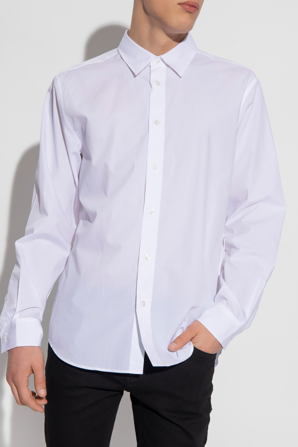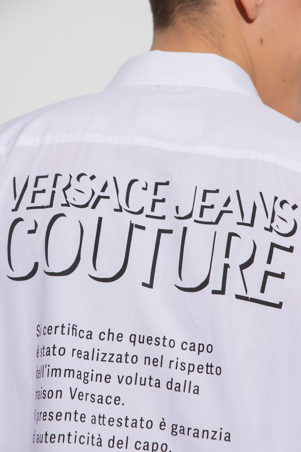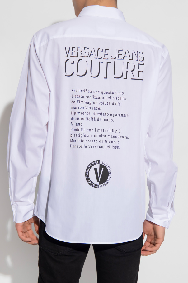 White shirt from Versace Jeans Couture. Made of cotton, this style fastens with buttons and showcases a black logo print at the back. It is complete with a collared neckline and long sleeves with button cuffs.