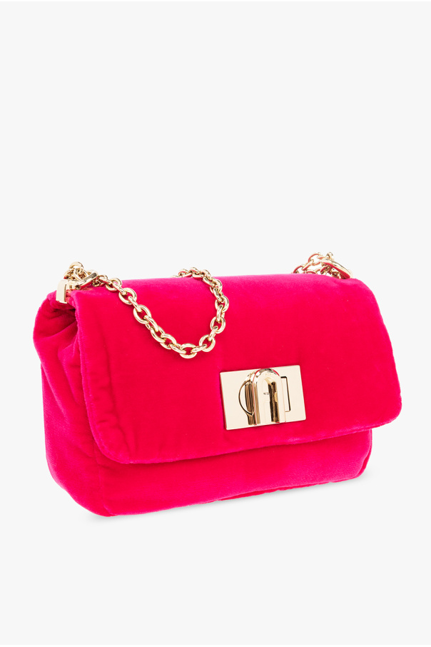 Pink ‘1927 Mini’ shoulder bag from Furla. Rendered in velvet fabric, this design secures with a logo-shaped twist fastener and features a back slip pocket, a chain-reinforced shoulder strap, gold-tone metal hardware and one internal compartment with a slip pocket.