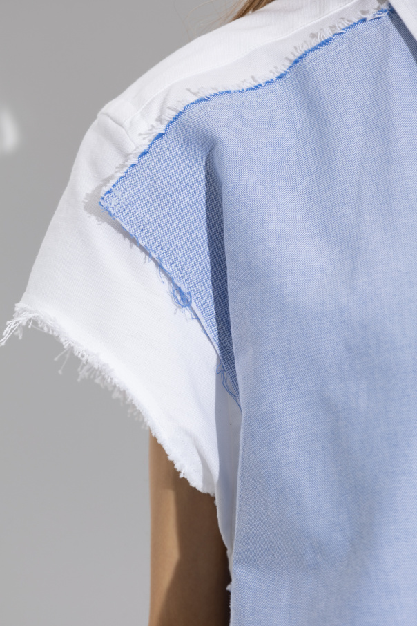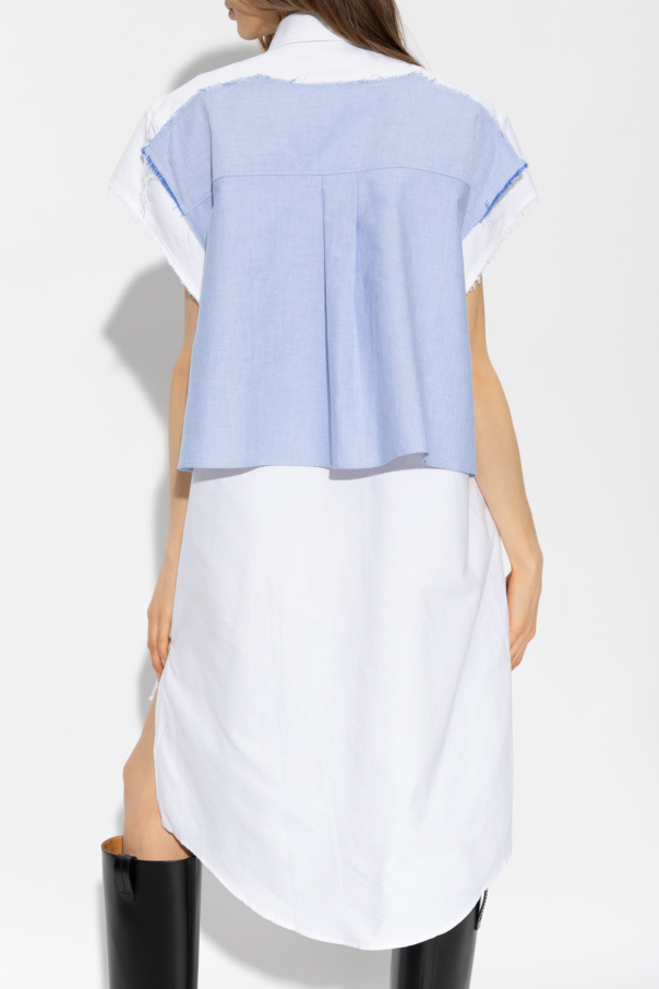 White and blue dress in contrasting fabrics from JW Anderson. Made of cotton, this short sleeve design features button fastenings, front pocket and raw cut edges.