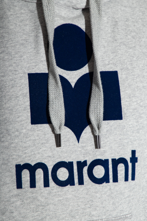 Grey ‘Miley’ hoodie from MARANT. Made of cotton, this garment features a navy logo pattern with a velvet finish, drawstring hood, slip pocket and ribbed trims at the hem and cuffs.